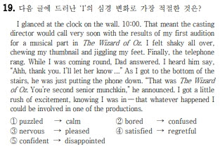 - 정답: ③ nervous → pleased (긴장 → 기쁨).