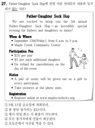 [Question | 문제] Father–Daughter Sock Hop에 관한 다음 안내문의 내용과 일치하지 않는 것은?
