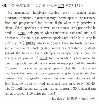 - ➡ 한국어 풀해석: 대형 포유류 초식동물 종들은 포식자나 인간으로부터 오는 위험에 각기 다른 방식으로 반응한다.