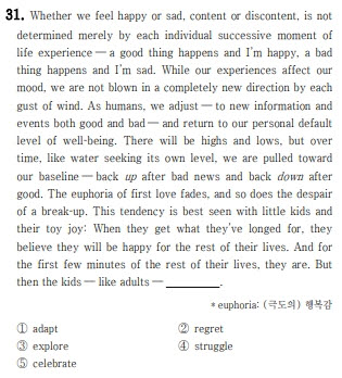 - 출제 의도: ‘헤도닉 적응(행복 수준의 회귀)’ 개념 파악 → 일반화 동사 선택.