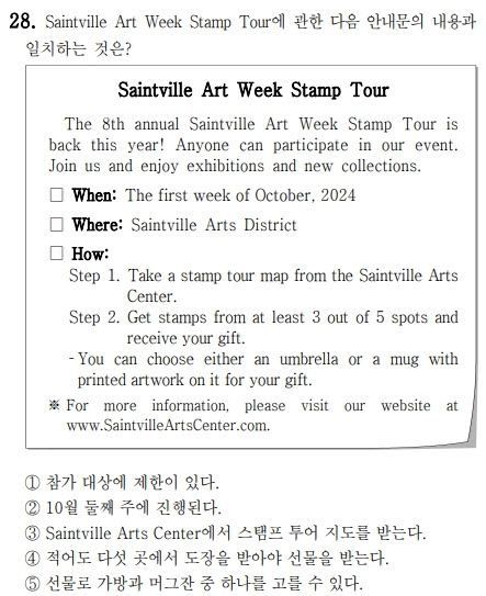 - 출제 의도: 안내문 사실 확인(대상, 일정, 절차, 선물)과 일치 판단.