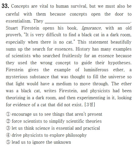 → 직독직해: 스튜어트 파이어스타인은 / 그의 책 Ignorance를 시작한다 / 한 옛 속담로, / “어두운 방에서 검은 고양이를 찾기는 매우 어렵다, / 특히 고양이가 없을 때에는.”